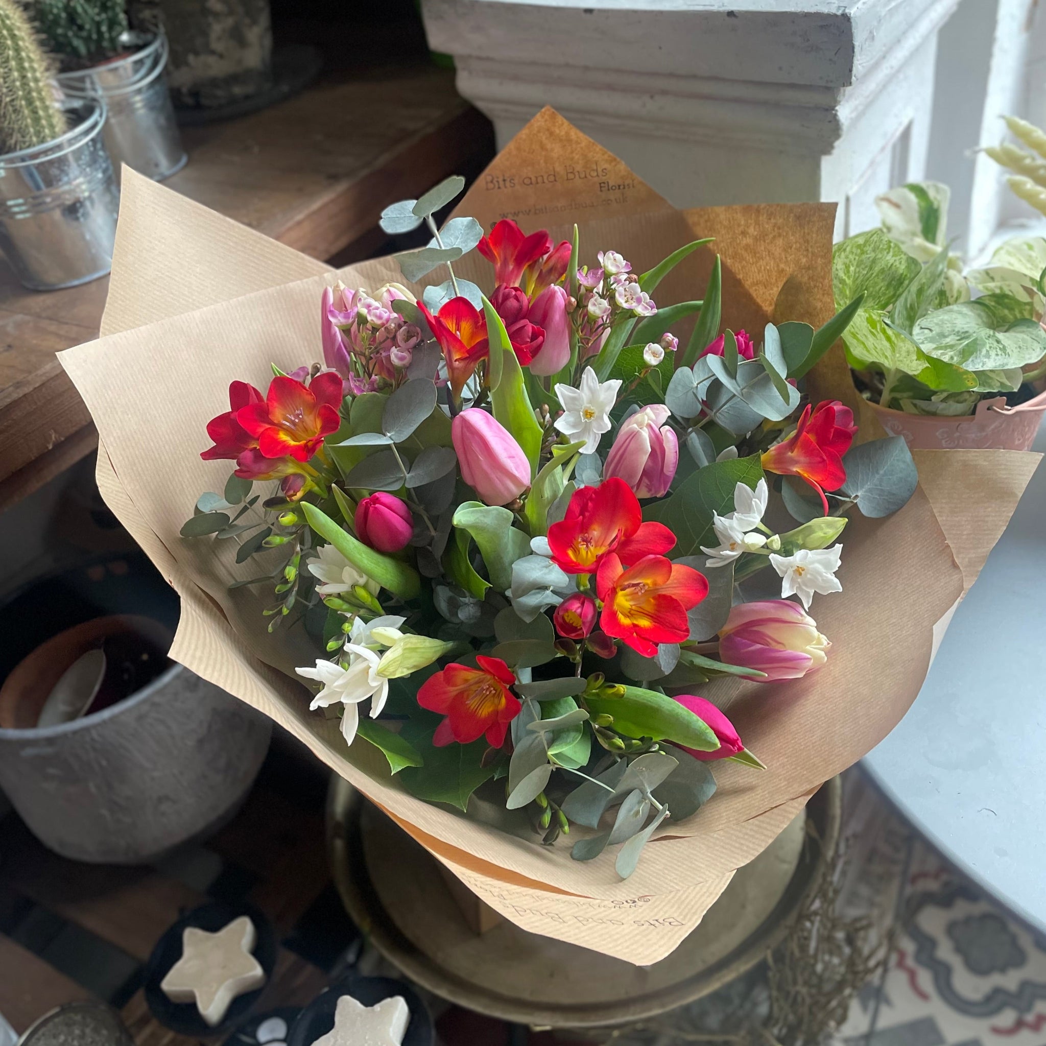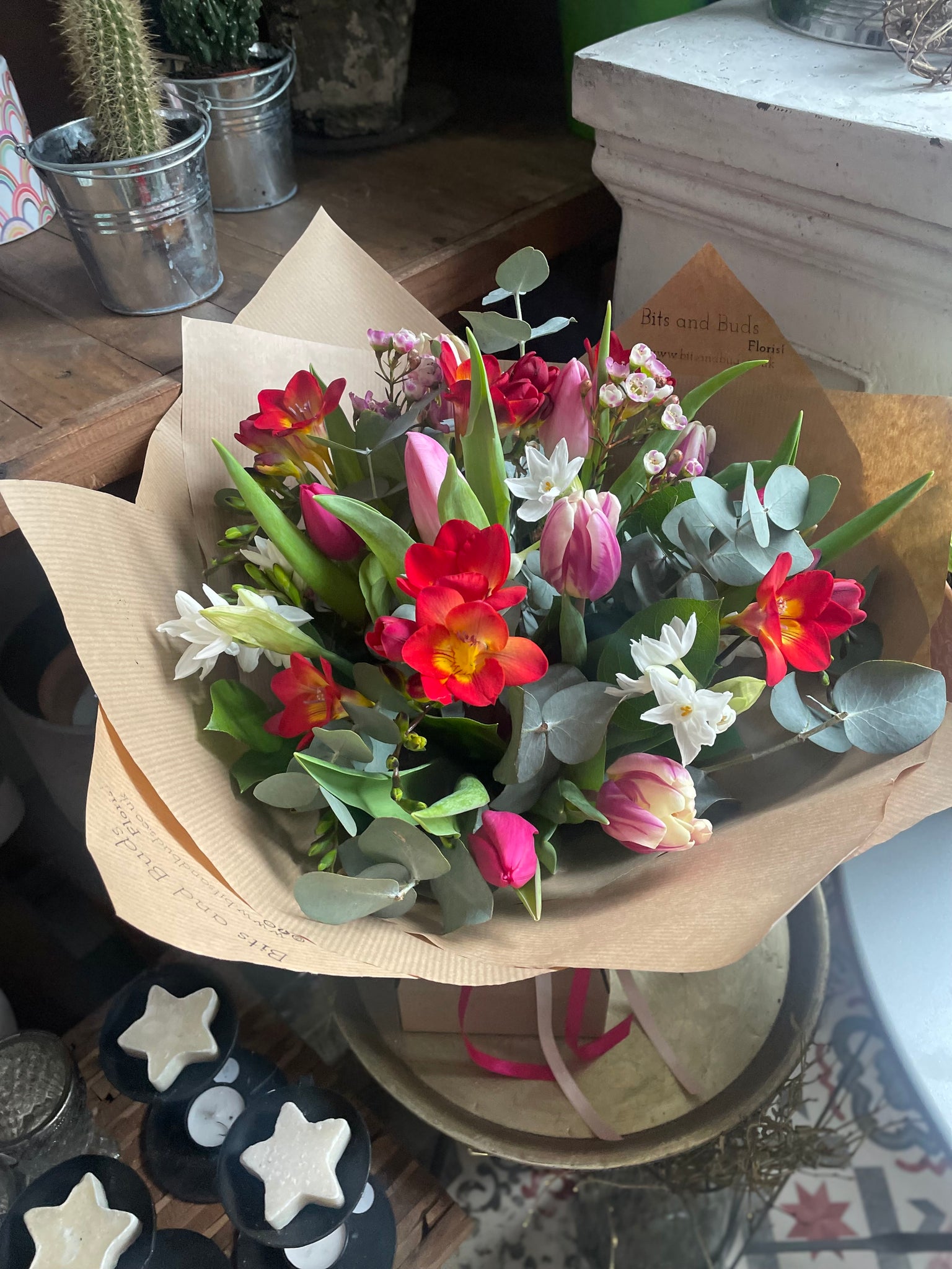 perfect flowers for valentine's and mother's day with mixed spring blooms of tulips, freesias and eucalyptus